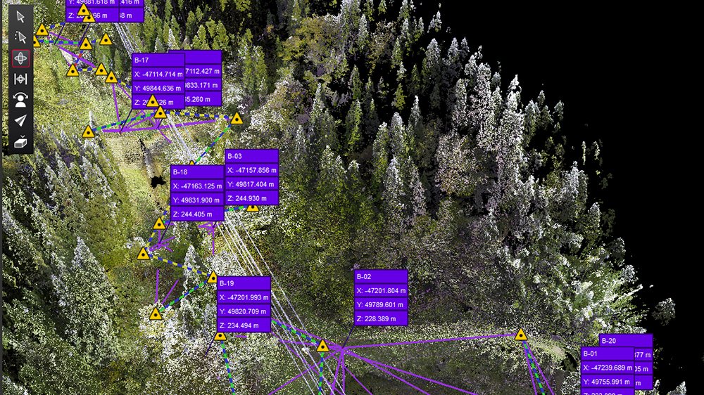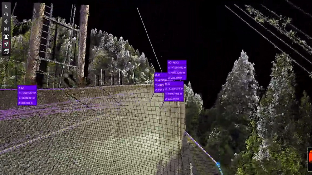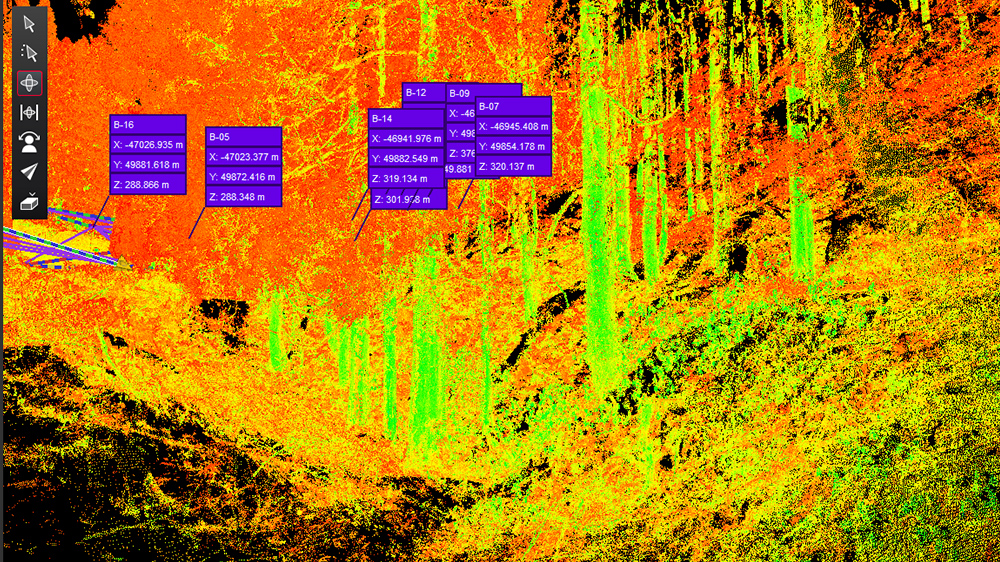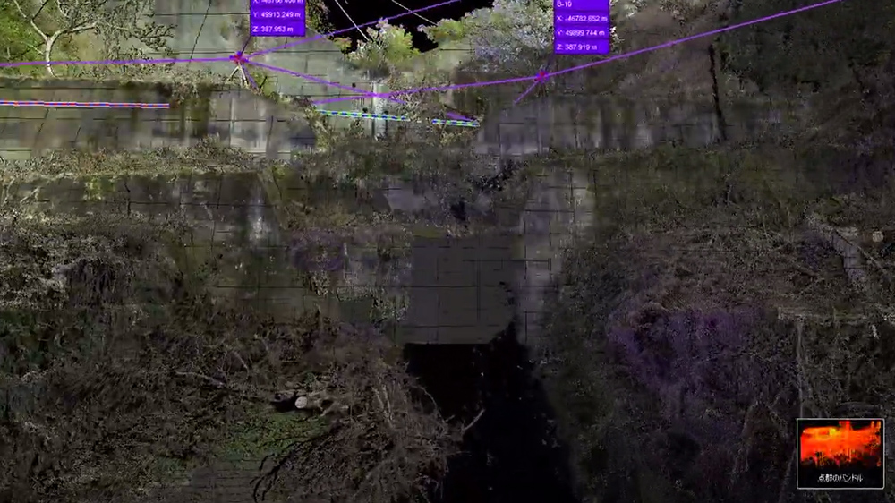 地上型3Dレーザスキャナ計測(3DL)とドローン(UAV)の欠点を補完し地形測量を実施。 本来なら3次元点群データを使用し設計計画を行ないますが、草樹木などの不要物を削除し、2次元平面図、任意の箇所での縦断面図、横断面図の作図も可能。