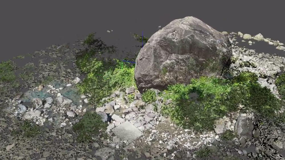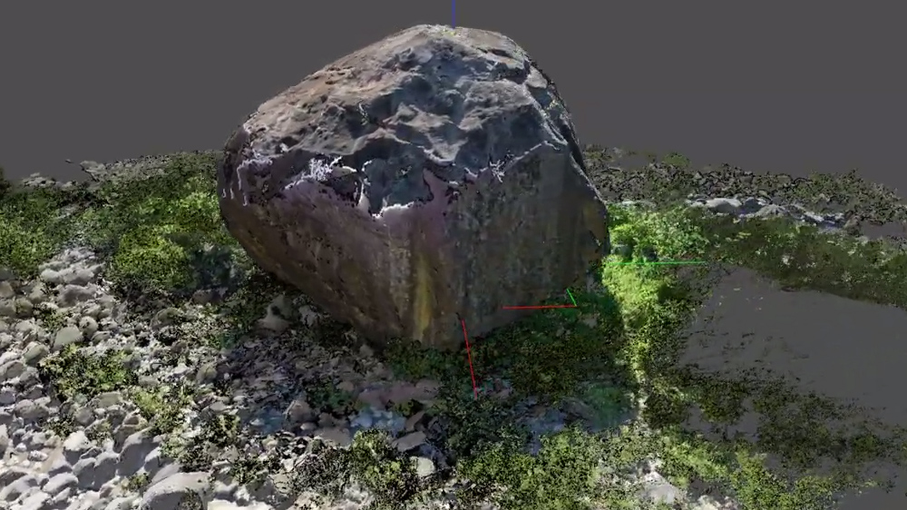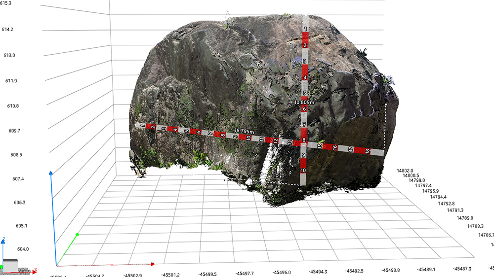 色々な角度から見ることが出来、復元保存等に活用出来ます。地上型3Dレーザスキャナ計測(3DL)とドローン(UAV)を併用し計測体積等正確に計測出来ます。
